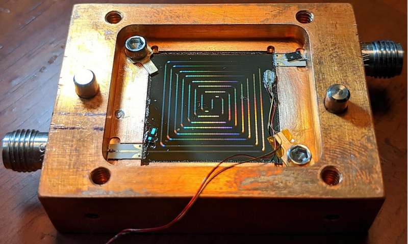 新型溫度計(jì)的尺寸僅為2.5 x 1.15毫米,可以安裝在另一個(gè)低溫微波設(shè)備中或固定在另一個(gè)低溫微波設(shè)備上,以測(cè)量安裝在芯片上的溫度。研究人員使用溫度計(jì)演示了超導(dǎo)微波放大器發(fā)熱的快速,準(zhǔn)確測(cè)量。