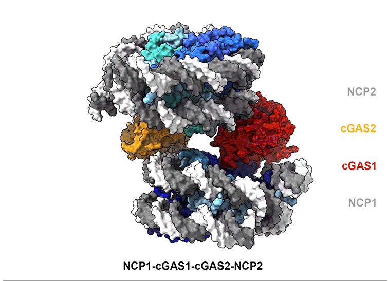 迄今為止,人們認(rèn)為cGAS主要在細(xì)胞質(zhì)中起作用,可以檢測外來的非自身DNA(例如病毒)。但是最近的研究表明,核內(nèi)也存在cGAS。考慮到該酶可能被其自身的DNA激活,從而引發(fā)針對其自身的DNA的有害炎癥反應(yīng),這令人費(fèi)解。這項(xiàng)觀察結(jié)果引起了Thom小組的研究人員的興趣,他們使用結(jié)構(gòu)生物學(xué)作為發(fā)現(xiàn)工具,發(fā)現(xiàn)cGAS以非活性狀態(tài)存在于細(xì)胞核中。他們與EPFL的Ablasser實(shí)驗(yàn)室合作,研究了細(xì)胞中染色質(zhì)對cGAS失活的機(jī)制。