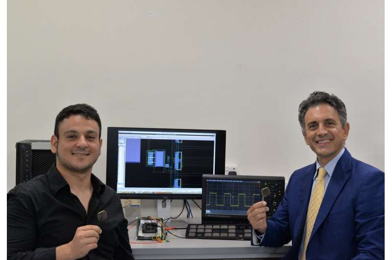 NUS研究人員發(fā)明了一種低成本的“無電池”喚醒定時(shí)器,可將IoT傳感器節(jié)點(diǎn)的功耗降低1000倍,從而有助于持久運(yùn)行。喚醒定時(shí)器嵌入在測試芯片中,并放置在較大的封裝中(由兩個(gè)研究人員持有),以便于測試和表征。左起:新加坡國立大學(xué)工程學(xué)院的Orazio Aiello博士和Massimo Alioto副教授