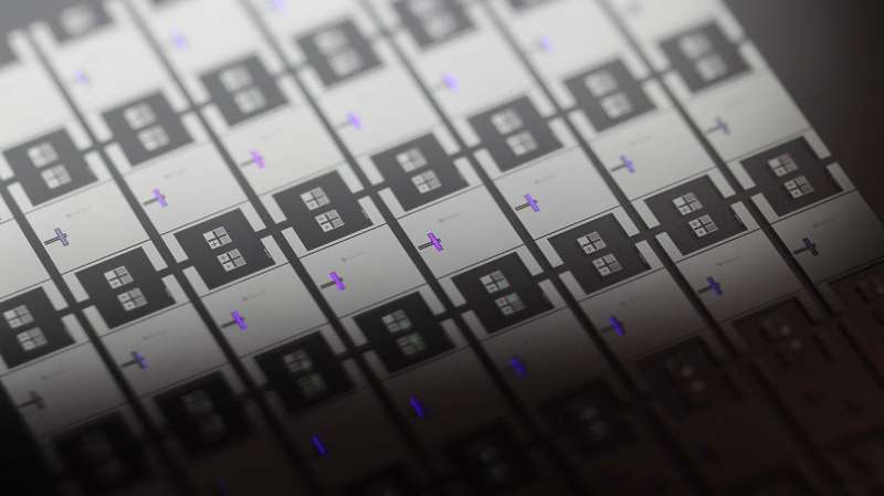 量子電路實驗中使用的聲波器件的陣列。明亮的紫色部分是設(shè)備的活動部分。圖片來源:凱文·薩辛格(Kevin J. Satzinger)