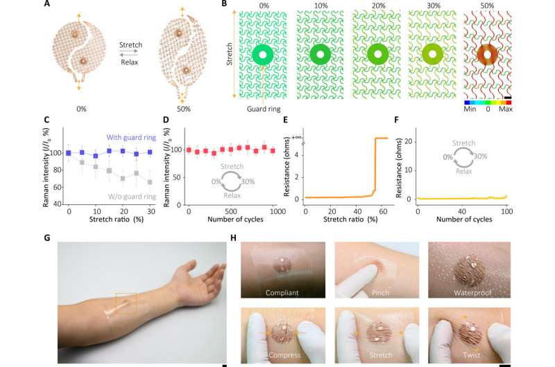 設(shè)備的機(jī)械特性。(A)傳感器變形時(shí)的光學(xué)圖像。(B)在各種變形下對可拉伸電極的保護(hù)環(huán)區(qū)域的FEM應(yīng)變分布分析,表明該保護(hù)環(huán)可以將較大的變形隔離到軟彈性體中,從而避免了對SERS傳感組件產(chǎn)生潛在的破壞性塑性應(yīng)變。(C)傳感器在各種變形下的SERS響應(yīng)。(D)循環(huán)拉伸試驗(yàn)后SERS傳感器的特性。(E)電極在各種變形下的電阻變化。(F)循環(huán)拉伸試驗(yàn)后電極中的電阻變化。(G)在人體皮膚上安裝的傳感器的照片,以及(H)在各種條件下的照片。圖片來源:浙江大學(xué)劉向江。比例尺為1毫米(B)和1厘米(G和H)。誤差線定義為±SD。圖片來源:Science Advances,doi:10.1126 / sciadv.abe4553