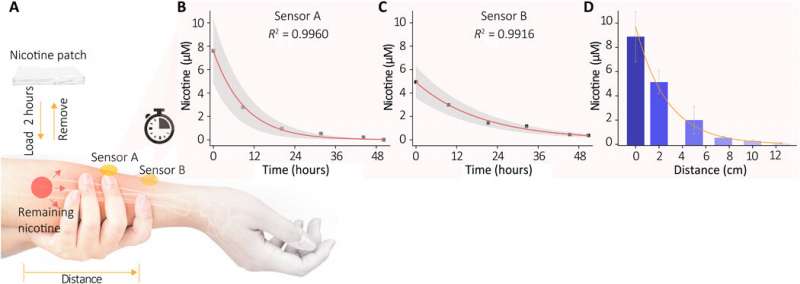 人體皮膚中尼古丁代謝過程的體內(nèi)監(jiān)測。(A)實(shí)驗(yàn)的示意圖。將包含?10 mg的尼古丁貼劑貼在志愿者的前臂上2小時(shí),然后將其取出。徹底清潔皮膚后,我們的傳感器會提取并分析皮膚中殘留的尼古丁。(B和C)從兩個(gè)位置(傳感器A直接位于修補(bǔ)區(qū)域;傳感器B連接約2厘米)測量了剩余尼古丁濃度的變化。在出汗20分鐘(0.5 mA離子電滲療法電流,10%乙酰膽堿氯化物負(fù)載的水凝膠)抽出20分鐘后進(jìn)行每次測量,并連續(xù)收集接下來10分鐘的傳感器響應(yīng)。圖中顯示了獲得的平均尼古丁水平。陰影區(qū)域表示測量值的±SD。(D)貼劑后抽出的汗液中尼古丁濃度的距離依賴性。六個(gè)傳感器沿著手臂放置在距修補(bǔ)區(qū)域0到12.5 cm的距離處。圖片來源:Science Advances,doi:10.1126 / sciadv.abe4553