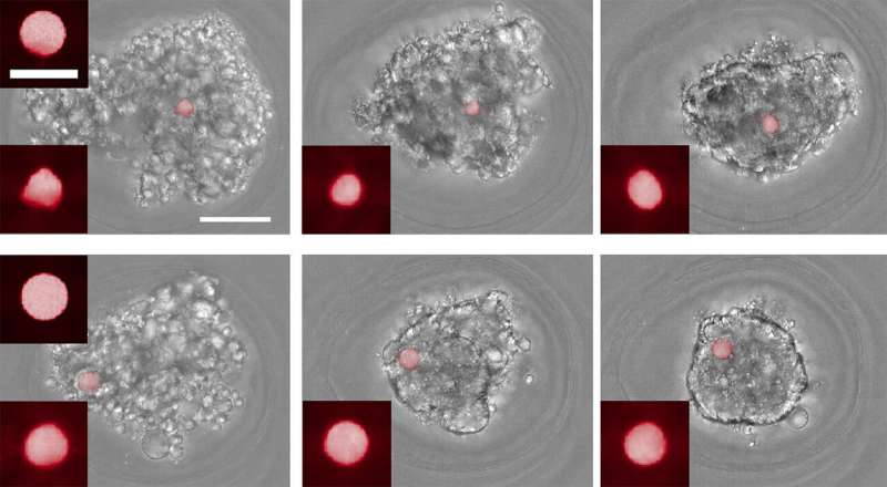在另一組實驗中,研究人員將傳感器球體添加到預(yù)先形成的細(xì)胞團中,以觀察這些球體如何被吸收到團塊中。一些球體已經(jīng)用膠原蛋白涂層處理過,可以使細(xì)胞與傳感器結(jié)合,而另一些則沒有涂層。