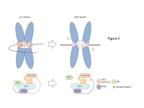在發(fā)表在《細(xì)胞生物學(xué)雜志》上的最新研究中,Terada 的團(tuán)隊(duì)發(fā)現(xiàn) SET/TAF1,一種 AML 的原癌基因,通過微調(diào) Aurora B 和 PP2A 的酶活性,也可用作張力傳感器。由于三個(gè)張力傳感器相互作用,復(fù)制的染色體均勻分布到新生細(xì)胞中,防止染色體異常。
