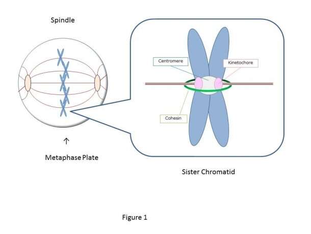 復(fù)制的染色體通過稱為粘連蛋白(綠色)的環(huán)狀蛋白質(zhì)配對在一起,成為姐妹染色單體。一個(gè)姐妹染色單體中有兩個(gè)動粒(粉紅色:sister kinetochores),當(dāng)從相反紡錘極伸出的繩狀微管抓住每個(gè)動粒時(shí),就會產(chǎn)生張力,染色體在中期板上對齊。圖片來源:早稻田大學(xué)寺田實(shí)驗(yàn)室