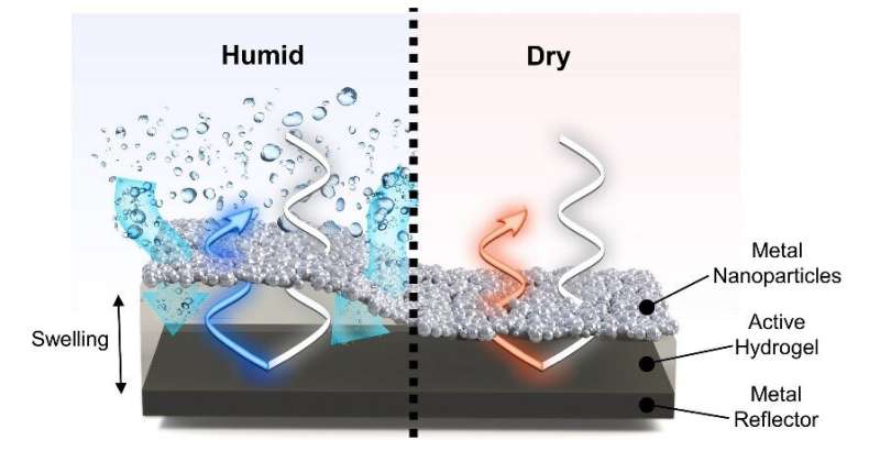研究小組制造了一種比色傳感器,該傳感器由金屬-水凝膠-金屬結(jié)構(gòu)組成,使用無(wú)序金屬納米顆粒層(殼聚糖水凝膠)和反射基板。當(dāng)外界濕度變化時(shí),由于殼聚糖水凝膠在潮濕狀態(tài)下膨脹,在干燥狀態(tài)下反復(fù)收縮的特性,傳感器的諧振頻率也會(huì)發(fā)生變化。