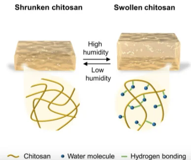 POSTECH 研究人員聲稱,這種殼聚糖(一種可生物降解的聚合物)水凝膠薄膜可以像超級海綿一樣快速膨脹和收縮:它可以吸收其周圍近 1,000 重量百分比的干重的水分。這種高吸水性質(zhì)量來自水分子和殼聚糖聚合物之間的氫鍵。