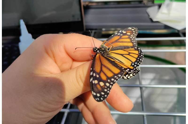 為了測試 mSAIL 的潛力,研究人員將該系統(tǒng)連接到植物園中的一只活帝王蝶身上。芯片粘在蝴蝶上;它沒有問題飛行,打開和關(guān)閉它的翅膀,或者在芯片就位的情況下進(jìn)行任何其他正常的蝴蝶行為。