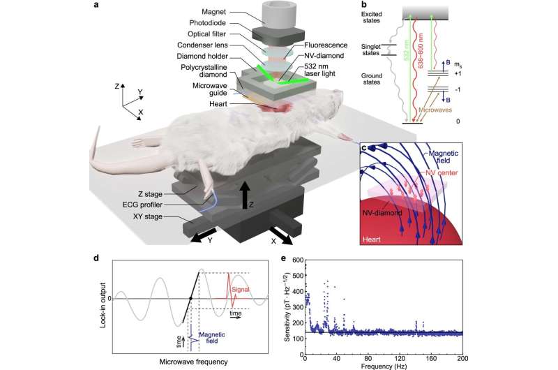 在近期發(fā)表在Communications Physics上的一項(xiàng)研究中,由日本東京工業(yè)大學(xué)(Tokyo Tech)的 Takayuki Iwasaki 副教授領(lǐng)導(dǎo)的一組科學(xué)家現(xiàn)在已經(jīng)開(kāi)發(fā)出一種新的裝置來(lái)執(zhí)行更高分辨率的 MCG。他們的方法基于包含氮空位的金剛石量子傳感器,這些空位充當(dāng)特殊的磁性“核心”,對(duì)心臟電流產(chǎn)生的微弱磁場(chǎng)敏感。
