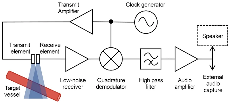 該設(shè)備測量頻移;接收回波的頻率與發(fā)射波束的頻率進(jìn)行比較。頻率變化(稱為多普勒頻移)與朝向或遠(yuǎn)離換能器的運(yùn)動(dòng)速度成正比。使用這種方法,貼片可以檢測到在兩個(gè)光束的重疊體積內(nèi)移動(dòng)的任何地方的血液。