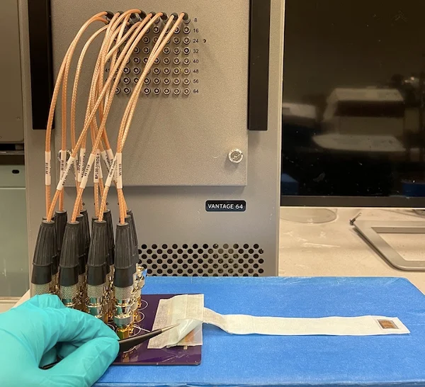 超聲波可穿戴設(shè)備連接到其完整的實(shí)驗(yàn)裝置。圖片由UCSD提供