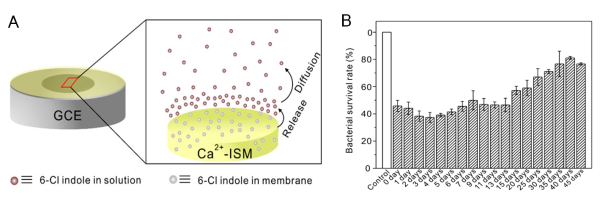 圖2.基于6-氯吲哚緩釋的防污損聚合物膜電位型傳感器的結(jié)構(gòu)(A)和長(zhǎng)期防污損效果(B)
