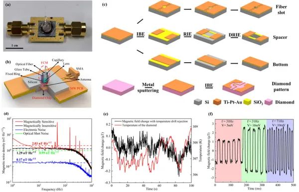 小型化、集成化、便攜化是鉆石量子傳感器取得實(shí)際應(yīng)用的重要條件。該團(tuán)隊(duì)基于晶圓級微機(jī)電工藝平臺,利用標(biāo)準(zhǔn)微納加工技術(shù),制備出鉆石量子磁傳感器的核心——鉆石芯片。芯片內(nèi)部集成了微波輻射結(jié)構(gòu),實(shí)現(xiàn)了原位微波量子態(tài)操控。研究采用金屬熱壓鍵合技術(shù),實(shí)現(xiàn)了鉆石單晶與硅晶圓的異質(zhì)集成,確保了機(jī)械穩(wěn)定性。鉆石芯片耦合帶有梯度變化折射率透鏡的光纖模塊,實(shí)現(xiàn)了“光進(jìn)光出”的工作模式,縮小了探頭尺寸,實(shí)現(xiàn)了鉆石磁強(qiáng)計(jì)探頭的高集成度。研究進(jìn)一步表明,采用雙頻共振技術(shù)可以同時(shí)進(jìn)行磁場和溫度場的同步實(shí)時(shí)測量,不僅通過溫漂限制提高了磁場測量的信噪比,而且確保了傳感器的溫度穩(wěn)定性。