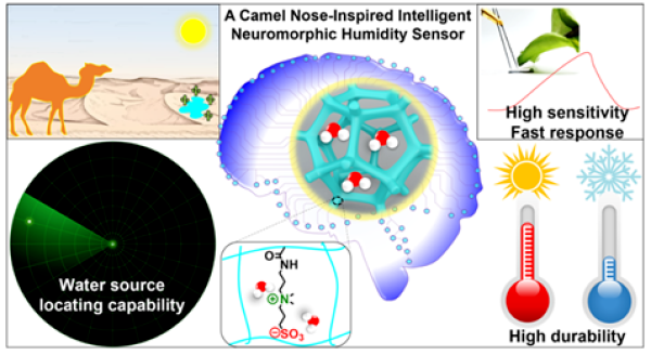 中國(guó)科學(xué)院福建物質(zhì)結(jié)構(gòu)研究所結(jié)構(gòu)化學(xué)國(guó)家重點(diǎn)實(shí)驗(yàn)室研究員黃偉國(guó)團(tuán)隊(duì)和中國(guó)科學(xué)院上海微系統(tǒng)與信息技術(shù)研究所副研究員宋健合作,通過(guò)模擬駱駝鼻子的結(jié)構(gòu),開(kāi)發(fā)了一種具有神經(jīng)形態(tài)的電容式濕度傳感器。他們利用聚合物交聯(lián)網(wǎng)絡(luò)多孔結(jié)構(gòu)與兩性離子濕度響應(yīng)的協(xié)同效應(yīng)制備出靈敏度高(~600)、響應(yīng)速度快(24s-1)、遲滯時(shí)間短、具有優(yōu)異耐用性的濕度傳感器。該傳感器在經(jīng)歷了水、鹽溶液、高低溫、3000次循環(huán)形變和重壓(2000kg)等外界條件影響后,傳感信號(hào)幾乎不變,展示了良好的耐用性和強(qiáng)大的抗環(huán)境干擾能力。在已報(bào)道的電容式濕度傳感器中擁有快的響應(yīng)速度,并可以模擬駱駝鼻子快速區(qū)分新鮮、陳舊和枯萎的葉子。此外,該傳感器還可實(shí)時(shí)監(jiān)測(cè)高溫工業(yè)廢氣的濕度水平,并具有良好的接觸式和非接觸式皮膚濕度感測(cè)特性,為實(shí)現(xiàn)無(wú)接觸人機(jī)交互輸入提供了新思路。