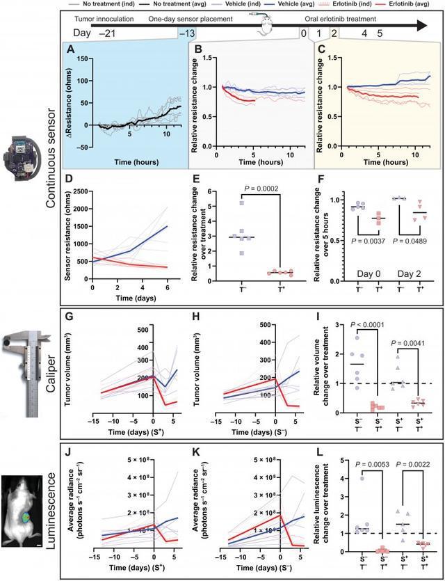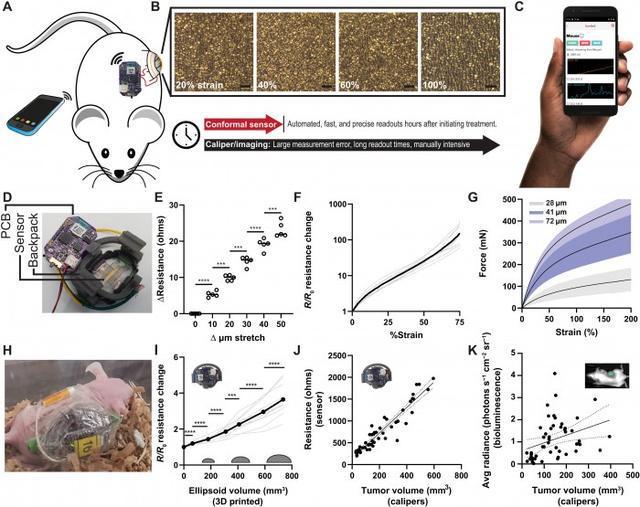 FAST的傳感器由一種靈活的、可拉伸的皮膚狀聚合物組成,其中包括一層嵌入式的黃金電路。這個(gè)傳感器與一個(gè)由前博士后和共同作者Yasser Khan和Naoji Matsuhisa設(shè)計(jì)的小型電子背包相連。該設(shè)備測(cè)量膜上的應(yīng)變--它拉伸或收縮的程度--并將該數(shù)據(jù)傳輸?shù)街悄苁謾C(jī)上。使用FAST背包,與腫瘤大小回歸有關(guān)的潛在療法可以迅速而有把握地被排除無(wú)效數(shù)據(jù),或協(xié)助醫(yī)務(wù)人員快速介入進(jìn)一步研究。