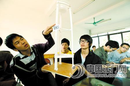 在演示現(xiàn)場,記者目睹了他們的成果。在一個(gè)可以將黃豆很快晃下高臺的模擬振蕩器上,將水塔放置其上,雖然水塔一直在晃動(dòng),但這座頂部有2.5公斤承重、僅僅由膠水粘連起來的塑料建筑物卻并沒有發(fā)生折斷或變形,通過了考驗(yàn)。