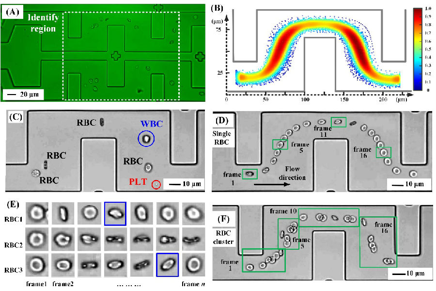 在微流控芯片方面,團隊利用交錯擠壓結構實現細胞單層直線排列,提出基于縮/擴結構的單細胞定點翻轉,仿真分析了寬流速范圍內(出口平均流速50~2000 μm/s)芯片功能的有效性及穩(wěn)定性。在單細胞識別、計數方面,團隊基于軌跡跟蹤的多角度形態(tài)學關聯分析方法,成功將單細胞識別平均精度由0.8622提升至0.9934,可有效剔除細胞重疊、聚團導致的誤識、漏識。在系統(tǒng)性能層面,實現測試通量約為8000個細胞/分鐘,樣本濃度一致性極限時長可達1小時。在臨床樣本檢測靈敏度及特異性方面,該研究開展了10例雙盲測試及75例臨床患者的大規(guī)模樣本分析驗證。結果表明,POCT設備與臨床用檢驗設備(血球儀)的細胞子類計數結果高度一致(R2>0.98),充分驗證了該方法的可行性及POCT設備在血細胞濃度異常現場診斷方面的應用潛力。