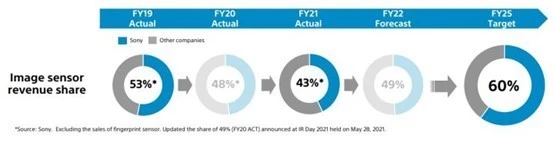 在今年 5 月舉行的索尼投資者關(guān)系日中的“圖像和傳感解決方案(I&SS)”部分,這位來自日本的圖像傳感器巨頭,除了公布了位于長(zhǎng)崎的 Fab5 進(jìn)一步擴(kuò)建計(jì)劃以及包含 JASM 在內(nèi)的投資項(xiàng)目等擴(kuò)產(chǎn)計(jì)劃以外,還強(qiáng)調(diào)了要在 2025 財(cái)年將索尼占整個(gè)圖像傳感器市場(chǎng)的營(yíng)收份額從 2021 財(cái)年的 43% 擴(kuò)大到 60%。