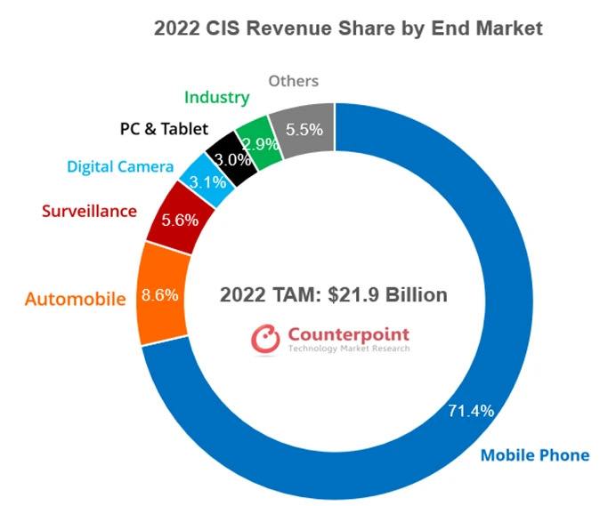 自從 20 多年前手機(jī)開始搭載相機(jī)模組以來,智能手機(jī)憑借著驚人的出貨量,逐漸成為圖像傳感器的頭號(hào)用戶。根據(jù) Counterpoint 今年的預(yù)測(cè)數(shù)據(jù),在 2022 年圖像傳感器的總營(yíng)收中有高達(dá) 71.4% 是由手機(jī)貢獻(xiàn)的。
