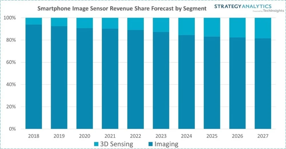 此外,圖像傳感器在非成像領(lǐng)域的應(yīng)用(例如汽車)也是一個(gè)機(jī)會(huì)。實(shí)際上,由于智能手機(jī)在圖像傳感器需求中的主導(dǎo)地位,對(duì)非成像領(lǐng)域圖像傳感器的強(qiáng)勁需求很可能被忽視了。“我認(rèn)為這一趨勢(shì)將繼續(xù)增長(zhǎng)。我對(duì)此很有信心,因?yàn)樵趫D像傳感器的許多應(yīng)用中,圖像本身并不是最終目標(biāo)”,知名圖像傳感器博客 Image Sensors World 的作者之一 Atul Ingle 在《集微訪談》節(jié)目中接受筆者采訪時(shí)表示。實(shí)際上,根據(jù) Strategy Analytics 的數(shù)據(jù),即便在手機(jī)領(lǐng)域,用于空間傳感的圖像傳感器營(yíng)收占比也呈現(xiàn)著逐年遞增的趨勢(shì)。