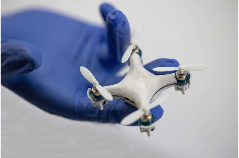 傳感器可以呈現(xiàn)出看似無(wú)窮無(wú)盡的各種形式。為了證明這一點(diǎn),研究小組創(chuàng)造了病毒傳感無(wú)人機(jī),其中的機(jī)身嵌入了傳感器材料。在飛行過(guò)程中,螺旋槳引導(dǎo)氣流通過(guò)無(wú)人機(jī)的多孔主體,著陸后可以對(duì)其進(jìn)行檢查。在示例中,無(wú)人機(jī)對(duì)空氣傳播的病原體(SARS-CoV-2)做出反應(yīng),可以從遠(yuǎn)程距離監(jiān)測(cè)環(huán)境。