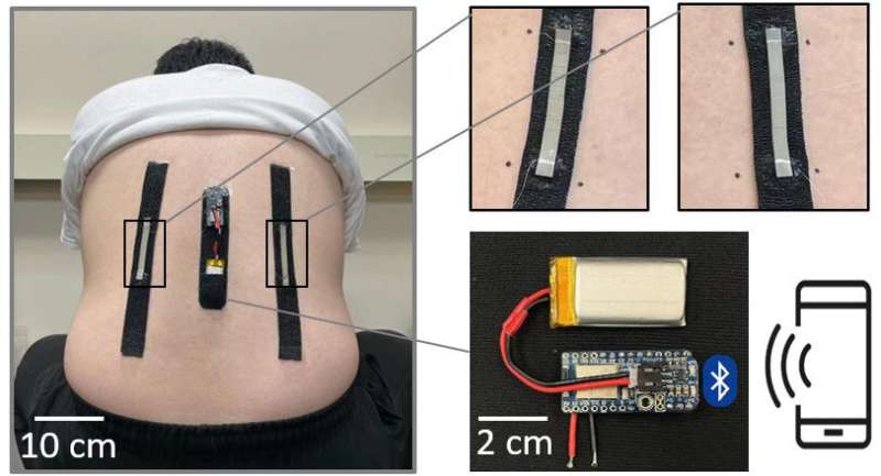 為了證明傳感器可以變形多遠(yuǎn),研究人員創(chuàng)造了一種可穿戴設(shè)備,用于監(jiān)測(cè)人的背部運(yùn)動(dòng),該設(shè)備可用于物理治療。來(lái)源:吳爽,北卡羅來(lái)納州立大學(xué)