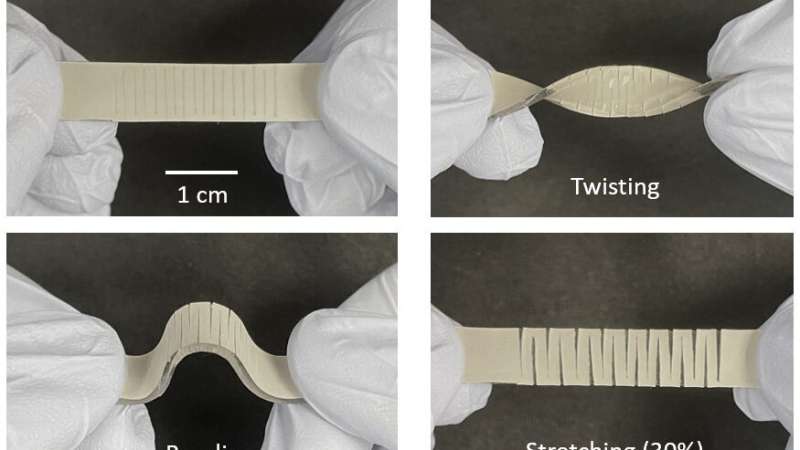 新傳感器由嵌入彈性聚合物中的銀納米線(xiàn)網(wǎng)絡(luò)組成。聚合物具有均勻深度的平行切割圖案,從材料的任一側(cè)交替:從左側(cè)切割一個(gè),然后從右側(cè)切割一個(gè),然后從左側(cè)切割一個(gè),依此類(lèi)推。