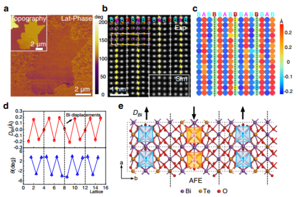 圖4.插層誘導(dǎo)的反鐵電相。a、具有反鐵電性樣品的PFM;b-d、反鐵電樣品中的原子尺度極化分布及晶格畸變分析;e、弛豫后的反鐵電相結(jié)構(gòu)模型。