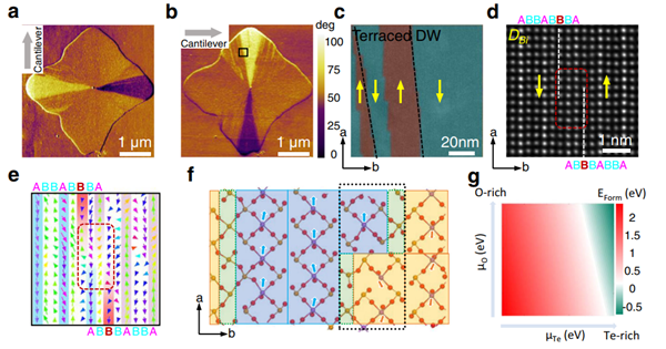 圖5.疇壁臺(tái)階的形成及插層對(duì)疇壁取向的影響。a-b、樣品中扇形鐵電疇的面內(nèi)PFM圖像;c、扇形鐵電疇邊緣處大量臺(tái)階形成的傾斜疇壁面;d-e、疇壁臺(tái)階的原子尺度HAADF-STEM圖像及對(duì)應(yīng)的離子位移分析;f、弛豫后的疇壁臺(tái)階結(jié)構(gòu)模型;g、Te和O濃度對(duì)疇壁臺(tái)階形成焓的影響。