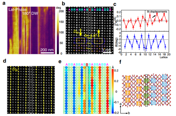 圖2.Bi/Te插層誘導(dǎo)的180°鐵電疇的形成。a、Bi2TeO5中典型條狀180°鐵電疇的面內(nèi)PFM;b、180°鐵電疇壁的原子尺度HAADF-STEM圖;c-e、180°鐵電疇壁處鐵電離子位移(DBi)及晶格畸變(晶格轉(zhuǎn)角θ)的原子尺度分析;f、弛豫后180°鐵電疇的結(jié)構(gòu)模型。