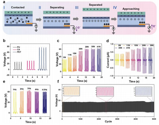 當(dāng)不同電子親和的物體在外力作用下與SPH層接觸時(shí),其表面產(chǎn)生等數(shù)的正負(fù)電荷。當(dāng)兩種材料分離時(shí),就形成了一個(gè)電位差。SPH表面的負(fù)電荷驅(qū)動(dòng)陽離子不斷轉(zhuǎn)移到離子凝膠中,以保持靜電平衡。同時(shí),由于電雙層的極化,在離子凝膠與金屬線的界面上形成相同數(shù)量的電子,通過外部電路流入地面。當(dāng)兩種摩擦電材料再次接觸時(shí),整個(gè)過程發(fā)生逆轉(zhuǎn)。因此,在周期性的接觸和分離過程中,垂直力被連續(xù)地傳遞到交流電壓/電流輸出中。文章測(cè)量了機(jī)械傳感器的電輸出性能。開路電壓(VOC)和短路電流(ISC)的形狀分別為上單峰和非下雙峰。當(dāng)施加的力從5N增加到41 N時(shí),VOC的峰值從33增加到62 V,ISC從0.71提高到1.62µA。