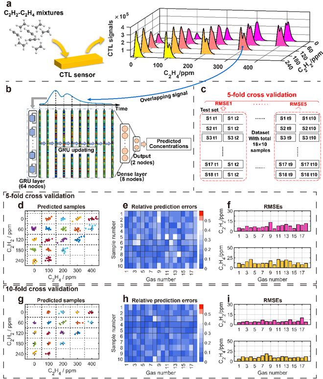 團隊以單個催化化學(xué)發(fā)光傳感器對乙烯-乙炔二元氣體的檢測為例,提出基于GRU(Gated Recurrent Unit)神經(jīng)網(wǎng)絡(luò)的混合物多組分智能檢測方法。該方法通過循環(huán)迭代的方式,能夠提取氣體傳感器的信號時序特征。該研究中,針對18種不同濃度配比的乙烯-乙炔二元氣體混合物,可直接根據(jù)傳感器響應(yīng)信號預(yù)測各組樣品的組分含量,在5折交叉驗證測試中,成功識別了這18種二元氣體樣本,準(zhǔn)確率達99.9%以上。