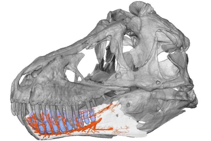 雖然已經(jīng)在幾種化石爬行動(dòng)物中分析了頜骨血管和神經(jīng)的形態(tài),但這項(xiàng)研究是對(duì)霸王龍下頜骨內(nèi)部結(jié)構(gòu)的研究。