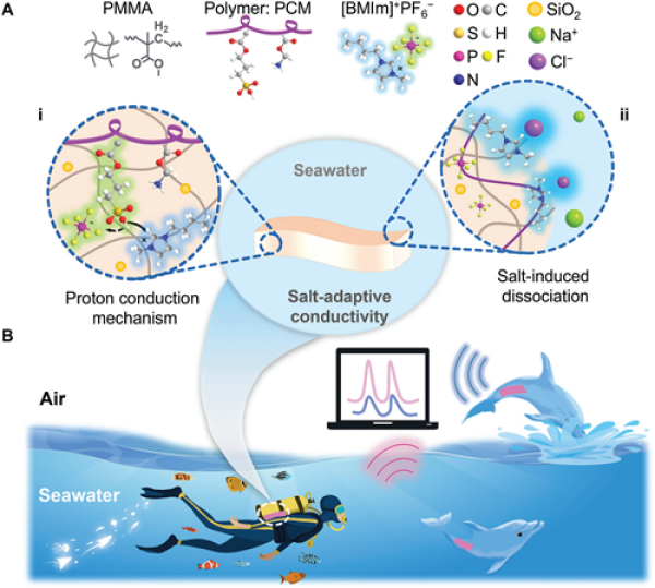 近年來,中國科學院寧波材料技術與工程研究所智能高分子材料團隊研究員陳濤和博士魏俊杰,致力于離子導電凝膠基智能傳感材料的研究,并利用疏水界面對水分子和導電離子的擴散屏障功能實現(xiàn)了導電凝膠材料的水下多功能傳感應用。然而,含鹽海水的高導電性會對離子凝膠傳感器的傳感性能產(chǎn)生明顯的抑制作用,導致離子導電凝膠的海洋傳感性能存在不足。對此,該團隊近期在疏水界面結構的基礎上,進一步利用質子導電機制和鹽誘導解離效應設計了在海水環(huán)境中具有鹽適應能力的離子液體凝膠材料,實現(xiàn)了海洋傳感應用。