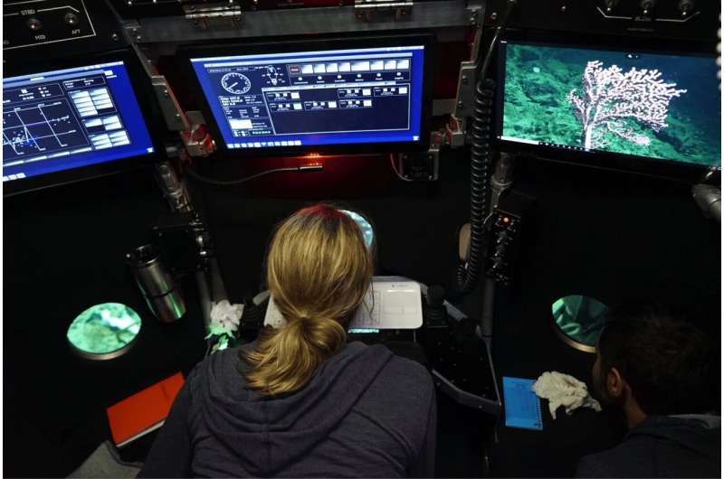 Alvin 操縱器將 SOLARIS 移動到 Paragorgia arborea 群落的表面。圖片來源:伍茲霍爾海洋研究所