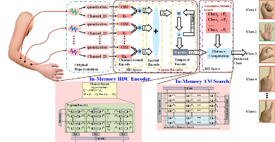 針對這一問題,微電子所微電子器件與集成技術(shù)研發(fā)中心劉明院士團(tuán)隊的尚大山研究員與香港大學(xué)合作,基于阻變存儲器(RRAM)的存內(nèi)計算范式,開發(fā)了面向時空信號處理的存內(nèi)高維計算編碼技術(shù)。團(tuán)隊采用2T2R(兩個晶體管與兩個RRAM為一個單元)陣列作為存內(nèi)高維計算的編碼器,通過在編碼器中原位執(zhí)行綁定和捆綁操作,并通過設(shè)計簡單的外圍電路進(jìn)行重排操作,實現(xiàn)了對時空信號的編碼。該方法利用電阻分壓原理映射超向量的元素,避免了矩陣—向量乘法過程中的陣列會聚電流過大的問題。此外,團(tuán)隊采用1T1R陣列作為關(guān)聯(lián)記存儲器。在訓(xùn)練階段,每個類別編碼后的超向量通過疊加構(gòu)成該類的原型向量,并預(yù)先存儲至關(guān)聯(lián)記憶存儲器中。在推理階段,輸入的時空信號首先被編碼為查詢超向量,然后以存內(nèi)搜索的方式與關(guān)聯(lián)記憶存儲器中的類原型向量進(jìn)行相似度計算。具有最大相似度的類即為預(yù)測結(jié)果。該設(shè)計在基于腦肌電信號的手勢識別任務(wù)中實現(xiàn)了97.96%的識別率。40nm工藝節(jié)點仿真結(jié)果表明該設(shè)計具有高魯棒、高通量、低延時等優(yōu)勢,同時計算能效相較于當(dāng)前的已報道的高維計算編碼器提升了39倍。這項研究結(jié)果為在資源有限的邊緣系統(tǒng)實現(xiàn)對時空信號的實時處理提供了一種高效的解決方案。