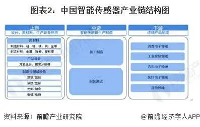 智能傳感器是物聯(lián)網(wǎng)技術的最底層和最前沿,對物聯(lián)網(wǎng)產(chǎn)業(yè)發(fā)展有著十分重要的意義。從產(chǎn)業(yè)鏈來看,智能傳感器上游主要為設計、原材料以生產(chǎn)設備供應;中游為智能傳感器器件加工制造與封裝測試;下游是終端產(chǎn)品制造,其中以消費電子、工業(yè)控制、汽車電子、醫(yī)療電子等應用領域為主。