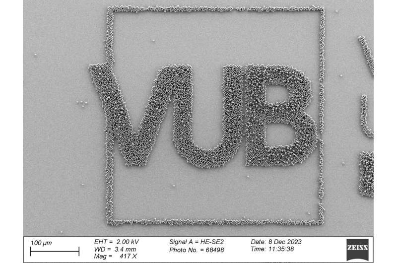 以 VUB 徽標(biāo)的受控形狀打印的微粒的 AFM 圖像。鱗片是100μm,是人類頭發(fā)的厚度。圖片來源:伊格納斯·吉米達(dá)爾