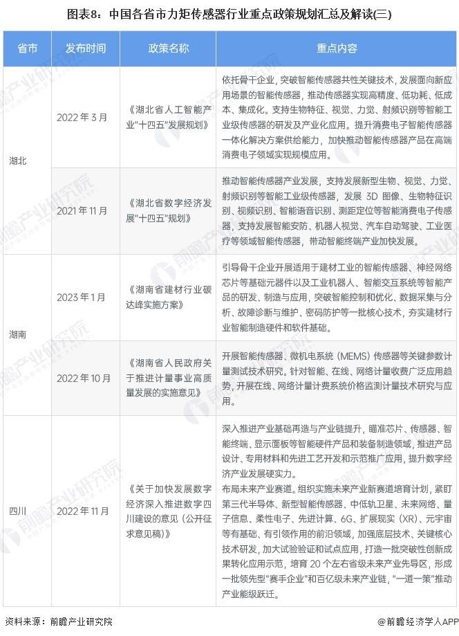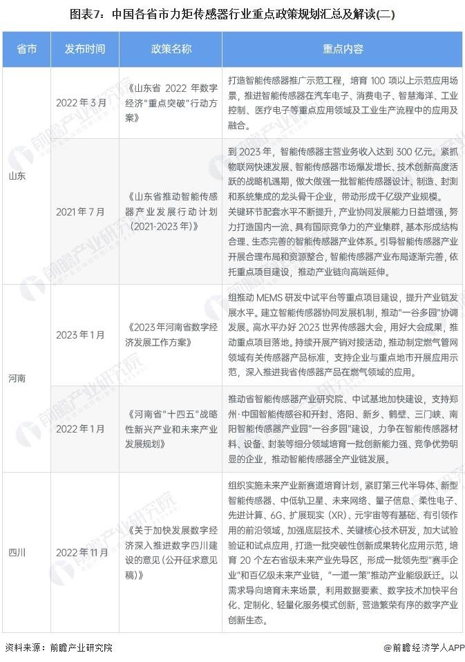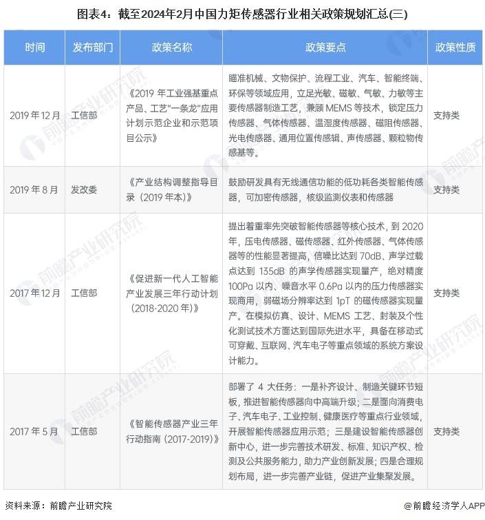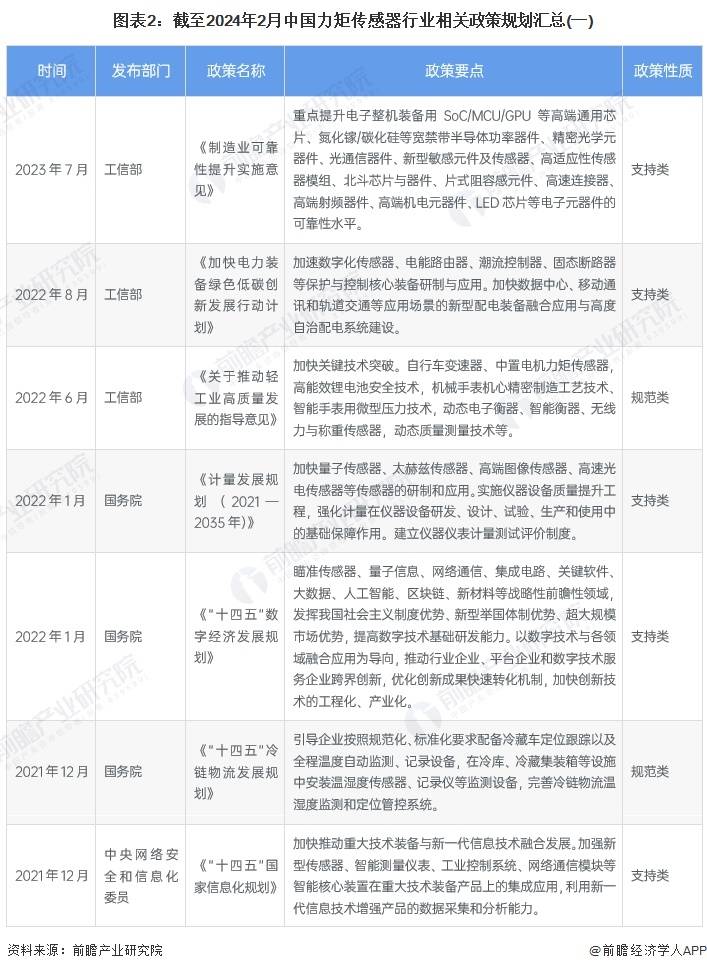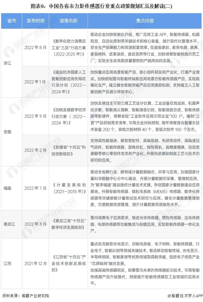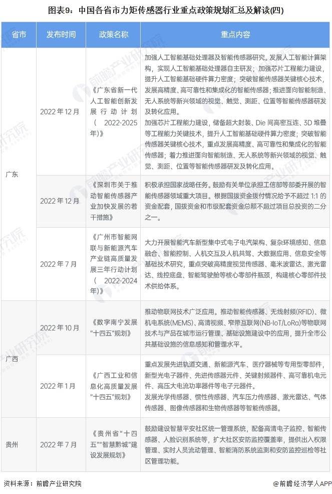 各地政策在傳感器方面發(fā)布的政策較多。盡管針對力矩傳感器的具體政策條文,但是力矩傳感器在高端裝備等領(lǐng)域應(yīng)用更加廣泛,因此各地政策主要鼓勵企業(yè)加強(qiáng)新型傳感技術(shù)研發(fā),高端、智能傳感器技術(shù)的突破!逗邶埥 笆奈濉睌(shù)字經(jīng)濟(jì)發(fā)展規(guī)劃》中提出推進(jìn)光學(xué)傳感器、慣性傳感器、壓電傳感器、電感傳感器等功能集成與規(guī)模應(yīng)用,實現(xiàn)智能傳感器一體化生產(chǎn)!稄V西工業(yè)和信息化高質(zhì)量發(fā)展“十四五”規(guī)劃》中提出發(fā)展光學(xué)傳感器、慣性傳感器、汽車壓力傳感器、激光雷達(dá)、氣體傳感器、圖像傳感器和生物傳感器等智能傳感器。