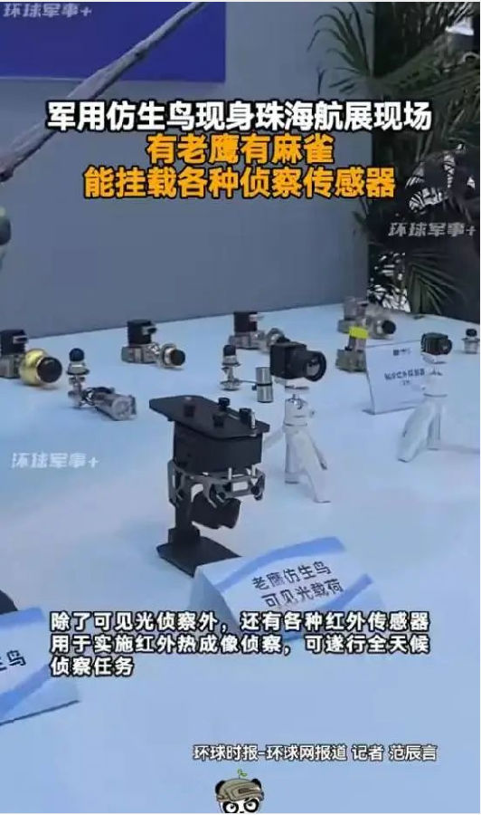 軍用仿生鳥(niǎo):在珠海航展現(xiàn)場(chǎng)的“中國(guó)軍工”展區(qū),展出了許多軍用仿生鳥(niǎo)及其配套的各種傳感器。它們之中有老鷹有麻雀,能掛各種偵察傳感器。這種形態(tài)逼真的仿生鳥(niǎo)在執(zhí)行隱蔽偵察任務(wù)中,撲翼無(wú)人機(jī)在空中盤(pán)旋,對(duì)手可能根本無(wú)法意識(shí)到自己正處于監(jiān)視中,猶如好萊塢電影中的畫(huà)面。