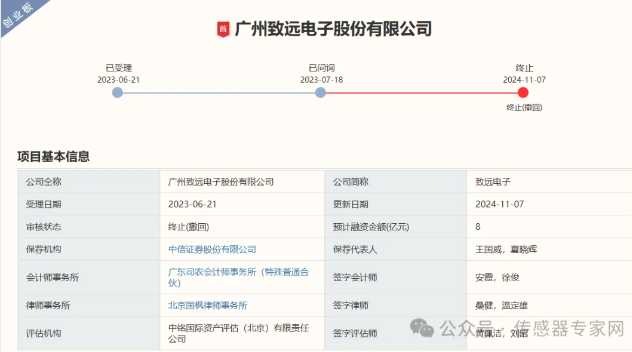 從上市信息看,致遠電子于2023年6月21日向深交所提交IPO申請獲受理,2023年7月18日獲問詢,并于2024年11月7日終止IPO審核,終止原因為“廣州致遠電子股份有限公司、保薦人撤回發(fā)行上市申請”。