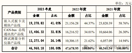 據(jù)招股書顯示,三大業(yè)務(wù)板塊中,嵌入式板卡及模塊產(chǎn)品線近三年占比均超過40%,是致遠電子營收支柱,2023年度營收1.93億元;CAN-bus 總線通訊類產(chǎn)品線營收占比30%左右,為第二大產(chǎn)品線,2023年度營收1.54億元;測試測量分析儀器產(chǎn)品線占比20%左右,2023年度營收1.23億元。