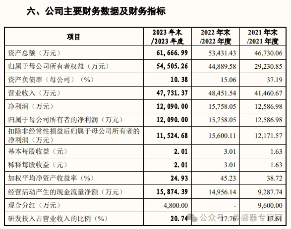 主要財務(wù)指標方面,2021-2023年報告期內(nèi),公司營業(yè)收入分別為 41,460.67 萬元、48,451.54 萬元和 47,731.37 萬元,實現(xiàn)凈利潤分別為 12,586.98 萬元、15,758.05 萬元和12,090.00 萬元。