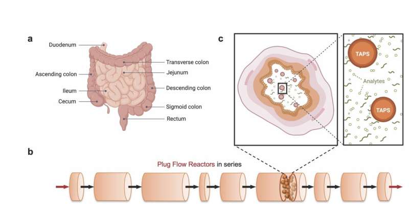 人體腸道系統(tǒng)(a)可被視作一系列活塞流反應(yīng)器(b),這是一種用于描述流動(dòng)圓柱體系內(nèi)化學(xué)反應(yīng)的模型。具有時(shí)間感知能力的微粒傳感器(c)在活塞流系統(tǒng)中移動(dòng),檢測(cè)被稱(chēng)為分析物的目標(biāo)化學(xué)物質(zhì)。圖片來(lái)源:馬寧等人,2025 年。部分圖片由 BioRender 軟件制作。