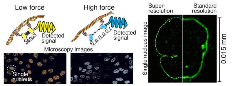 左側細胞內(nèi)力傳感器的作用原理。熒光蛋白(黃色和青色)源自水母,而類似橡皮筋的部分(黑色)利用了蜘蛛網(wǎng)蛋白。目標蛋白結合抗體(深棕色)源自羊駝。右側圖像是超分辨率顯微鏡與傳統(tǒng)顯微鏡對細胞核成像的對比。圖片來源:蒂穆・伊哈萊寧,坦佩雷大學