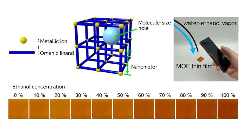 這些金屬有機框架(MOF)含有納米級孔隙,可吸收乙醇分子并通過可見的顏色變化作出響應 —— 這一現(xiàn)象被稱為溶劑化 / 蒸氣致色效應。得益于低光散射特性和高透明度,Cu-MOF-74 薄膜無需復雜實驗室設備即可實現(xiàn)精確光學測量。