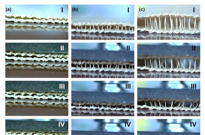雙拉舍爾結(jié)構(gòu)隨間隔紗長(zhǎng)度變化的變形與恢復(fù)實(shí)時(shí)觀測(cè):(a) 2 毫米,(b) 5 毫米,(c) 15 毫米。羅馬數(shù)字對(duì)應(yīng)圖 8 中壓電能量產(chǎn)生的階段。圖片來(lái)源:《先進(jìn)功能材料》(2025)。DOI: 10.1002/adfm.202504271