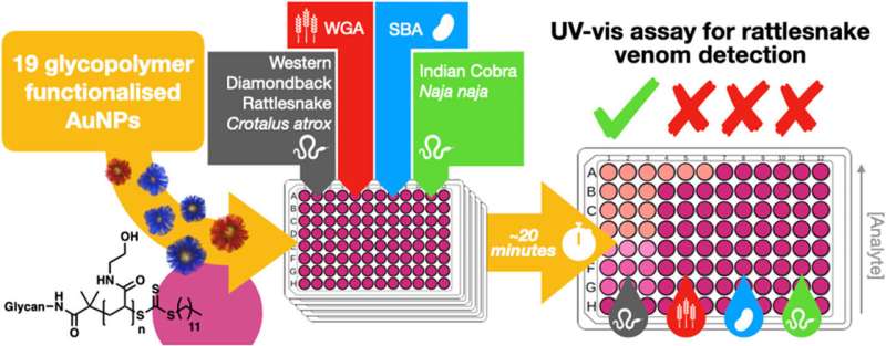 為開發(fā)針對該蛇毒的檢測試驗,研究團(tuán)隊設(shè)計了模擬毒液蛋白靶向的天然糖受體的合成糖鏈(糖聚合物),并將其連接到金納米顆粒上以放大反應(yīng)信號并可視化 —— 當(dāng)毒液毒素與合成糖結(jié)合時,檢測試劑會發(fā)生顏色變化。