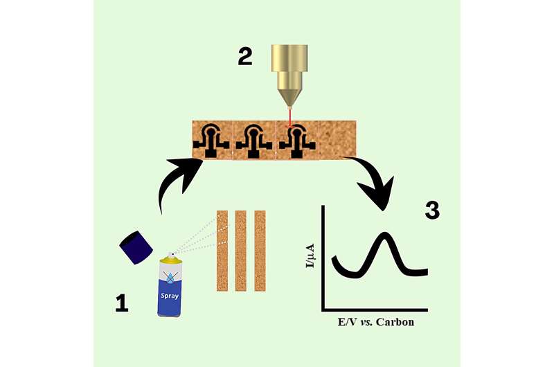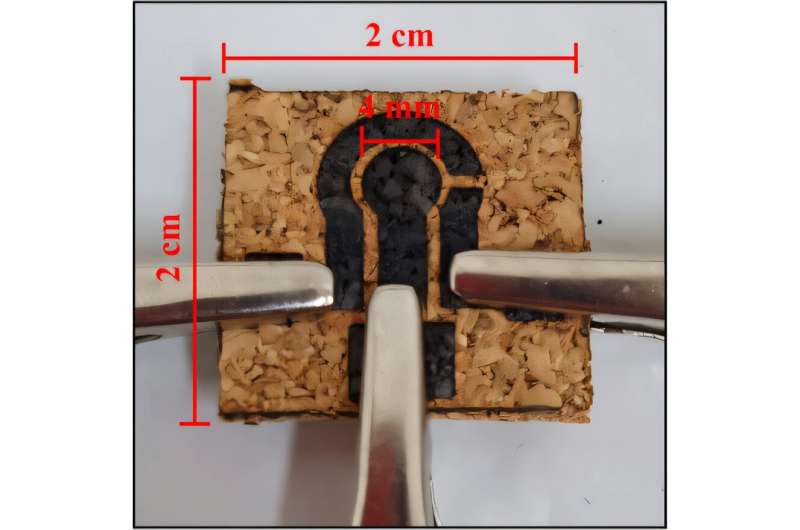 研究團(tuán)隊(duì)通過激光標(biāo)記對軟木樣品進(jìn)行處理,將其轉(zhuǎn)化為石墨烯 —— 一種高導(dǎo)電性的碳材料。整個(gè)過程仿佛是聚焦的光束在軟木內(nèi)部 “繪制” 出導(dǎo)電通路。亞內(nèi)吉茨解釋道:“這種工藝具有可持續(xù)性,無需使用有毒試劑,且能生成高導(dǎo)電性材料。這一點(diǎn)至關(guān)重要,因?yàn)閬喯跛猁}的電化學(xué)氧化反應(yīng)是已知的,因此我們需要高導(dǎo)電性的傳感器才能實(shí)現(xiàn)對該物質(zhì)的檢測!