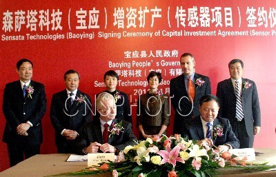 1月19日,美國森薩塔科技公司在揚(yáng)州正式簽約增資擴(kuò)產(chǎn)(寶應(yīng))傳感器項(xiàng)目。當(dāng)日,揚(yáng)州市委書記王燕文、市長謝正義等官員和來自美國森薩塔科技公司總裁兼首席運(yùn)營官瑪莎·蘇利文、執(zhí)行副總裁、首席財(cái)務(wù)官、首席行政官杰夫·科特等共同參加簽約儀式。圖為寶應(yīng)縣縣長王庭國與森薩塔科技運(yùn)營高級(jí)副總裁迪克·。ㄓ遥┓謩e代表雙方簽約,增資擴(kuò)產(chǎn)傳感器項(xiàng)目,將新建32500平方米的五層廠房,預(yù)計(jì)在2011年2月動(dòng)工并在年底竣工。